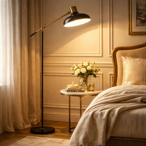 Soleil Adjustable Arc Floor Lamp — Black & Gold Industrial, 48"–65"