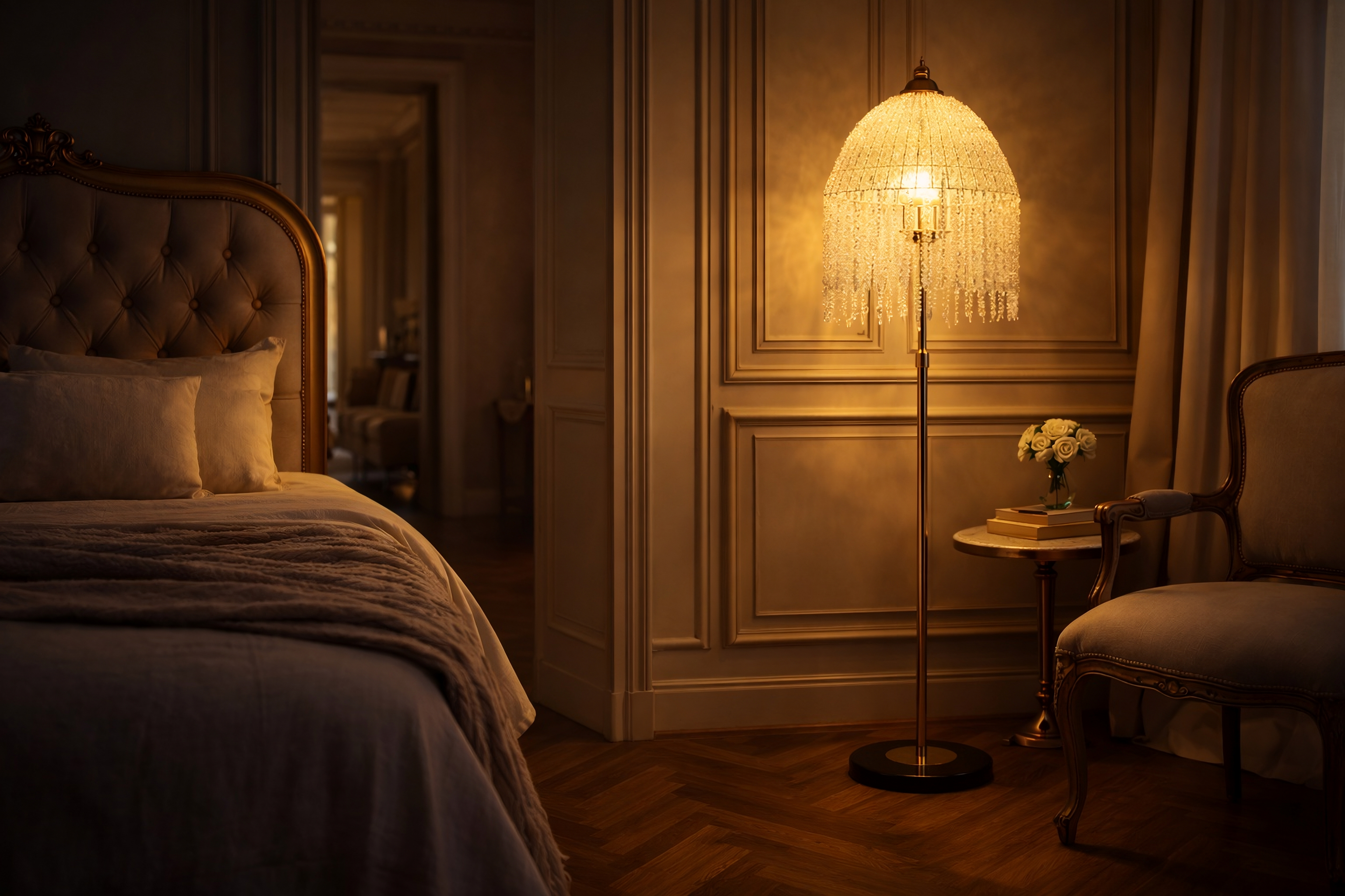 Versailles 3-Light Crystal Floor Lamp — Gold Frame & Cascading Waterfall Beads, 63"